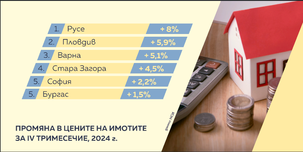 Така за последното тримесечие на 2024 г., най-много са поскъпнали имотите в Русе. Скокът е с 8% в сравнение с предходното тримесечие. Следва Пловдив с близо 6% увеличение за 3 месеца, Варна и Стара Загора – с около 5%, и София и Бургас с най-малкото увеличение от под 3%.