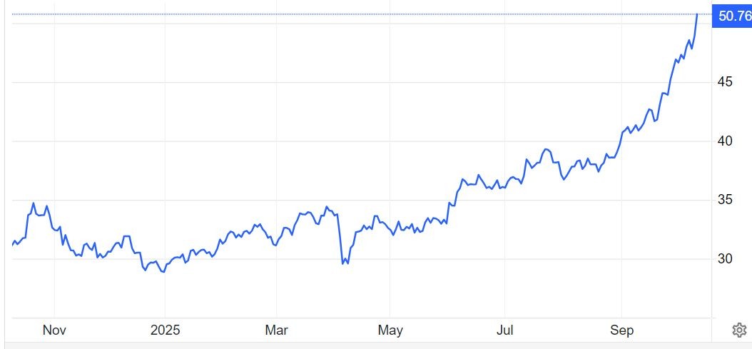 Среброто поскъпна с над 3% по време на търговията в четвъртък, пробивайки за пръв път в историята над психологическото ниво от 50 долара за унция до нов рекорден връх около $50,85.