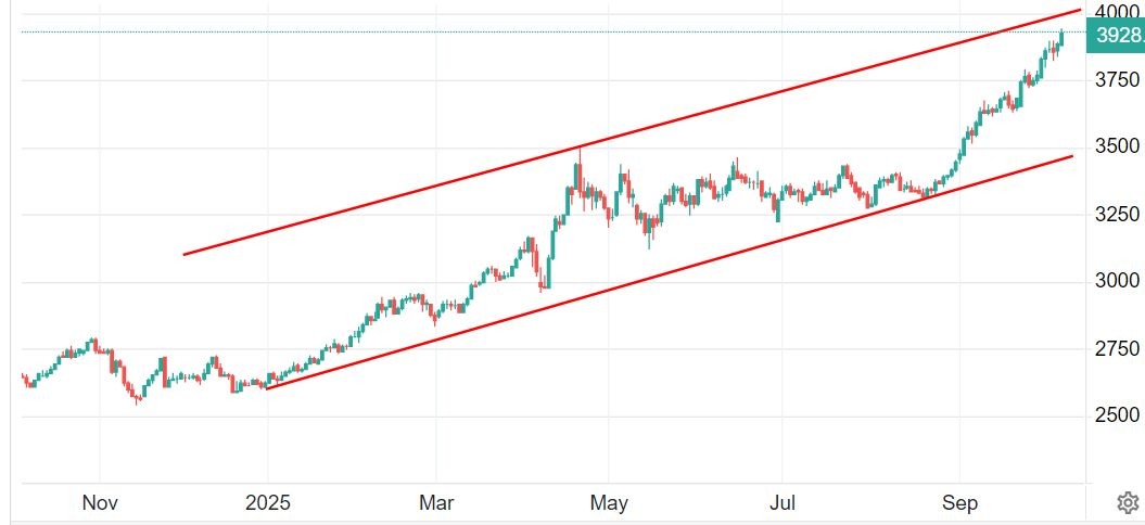 Златото продължава да поскъпва, като в началото на днешната търговия достигна нов рекорден ценови връх около $3944 за унция, доближавайки важната психологическа бариера от $4000 с оглед на продължаващото блокиране на дейността на федералното правителство в САЩ, което засилва статута на благородния метал като "инвестиция-убежище".
