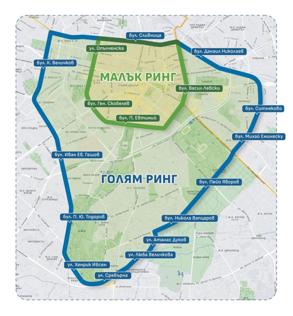 Зоната със забрана – „голям ринг“, е заключена между бул. „Сливница“, бул. „Данаил Николаев”, бул. „Ситняково“, бул. „Михай Еминеску“, бул. „П. Яворов“, бул. „Никола Й. Вапцаров“, ул. „Атанас Дуков“, ул. „Люба Величкова“, ул. „Сребърна“, бул. „Х. Ибсен“, бул. „П. Ю. Тодоров“, бул. „И. Е. Гешов“ и бул. „К. Величков“.